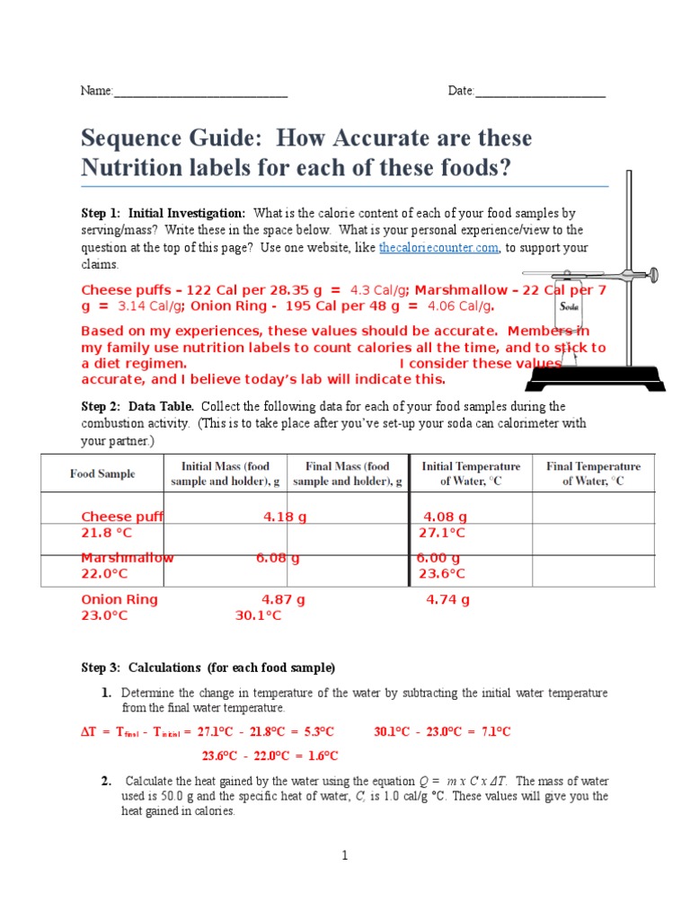 Sequence Guide Soda Can Calorimeter Student Sample PDF Food